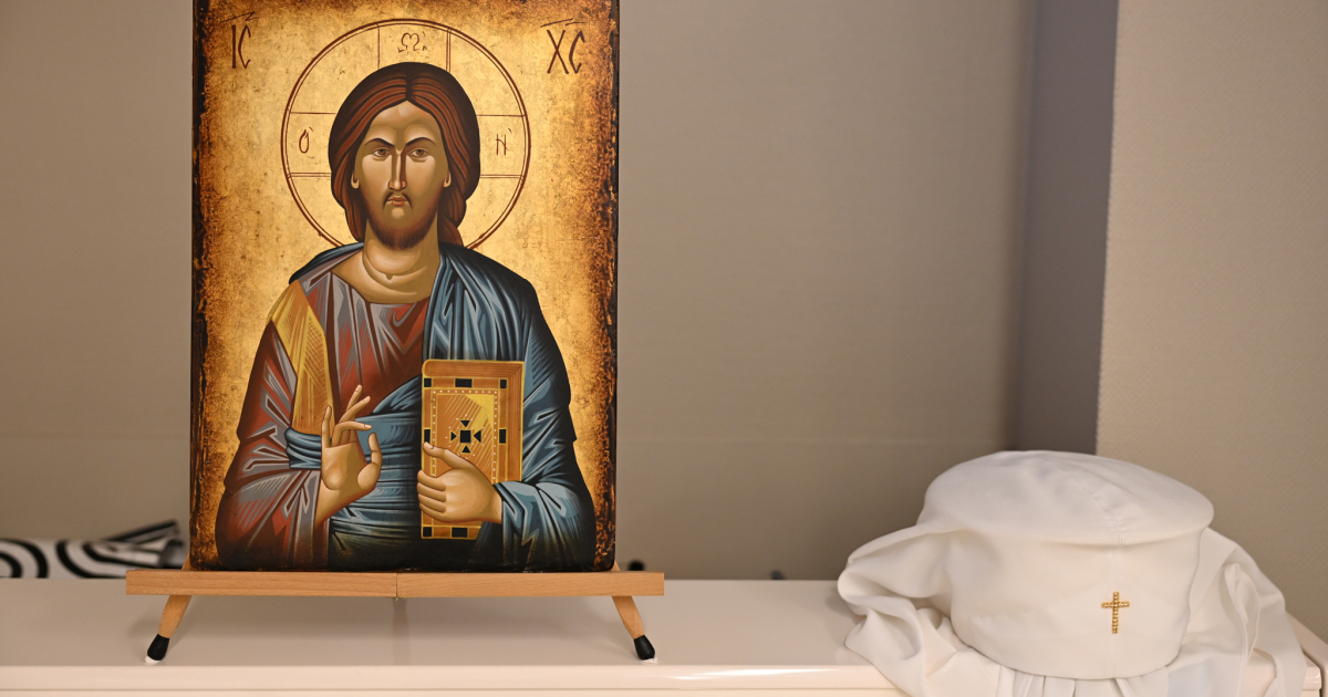 Kuvituskuva kirkolliskokouksesta 2025: Arkkipiispa Elian klobukki ja ikoni.