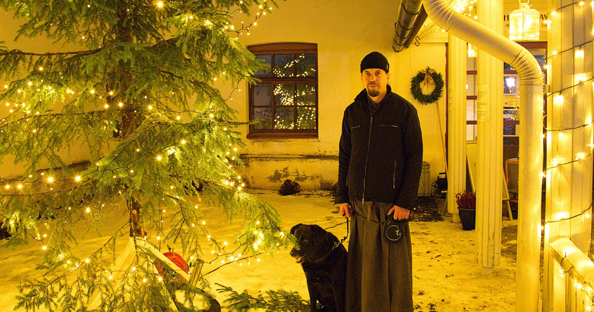 Pääkuva ylhäällä: Isä Nasari ja Sulo-koira ovat tuttu näky luostarin pihapiirissä. Kuva: Tapio Tiimonen