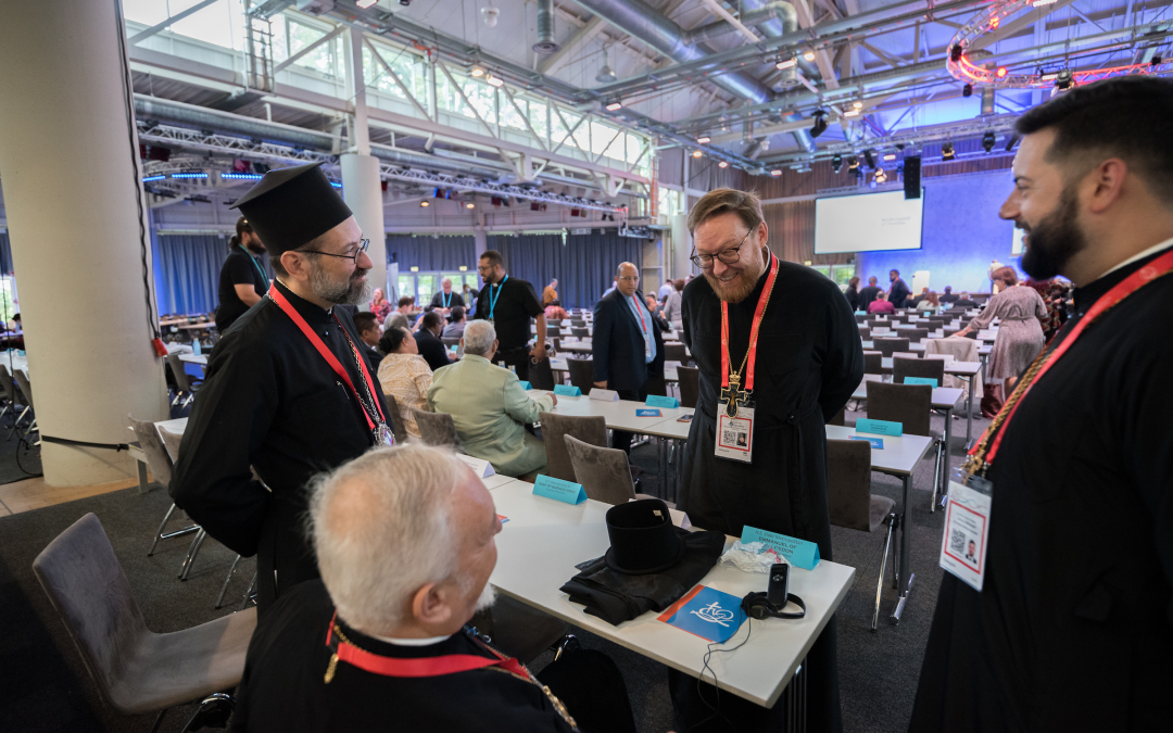 Pääkuva ylhäällä: Venäjän ortodoksisen kirkon arkkimandriitta Filaret (Bulekov) tervehtimässä ekumeenisen patriarkaatin delegaatiota Kirkkojen maailmanneuvoston yleiskokouksessa Karlsruhessa.
