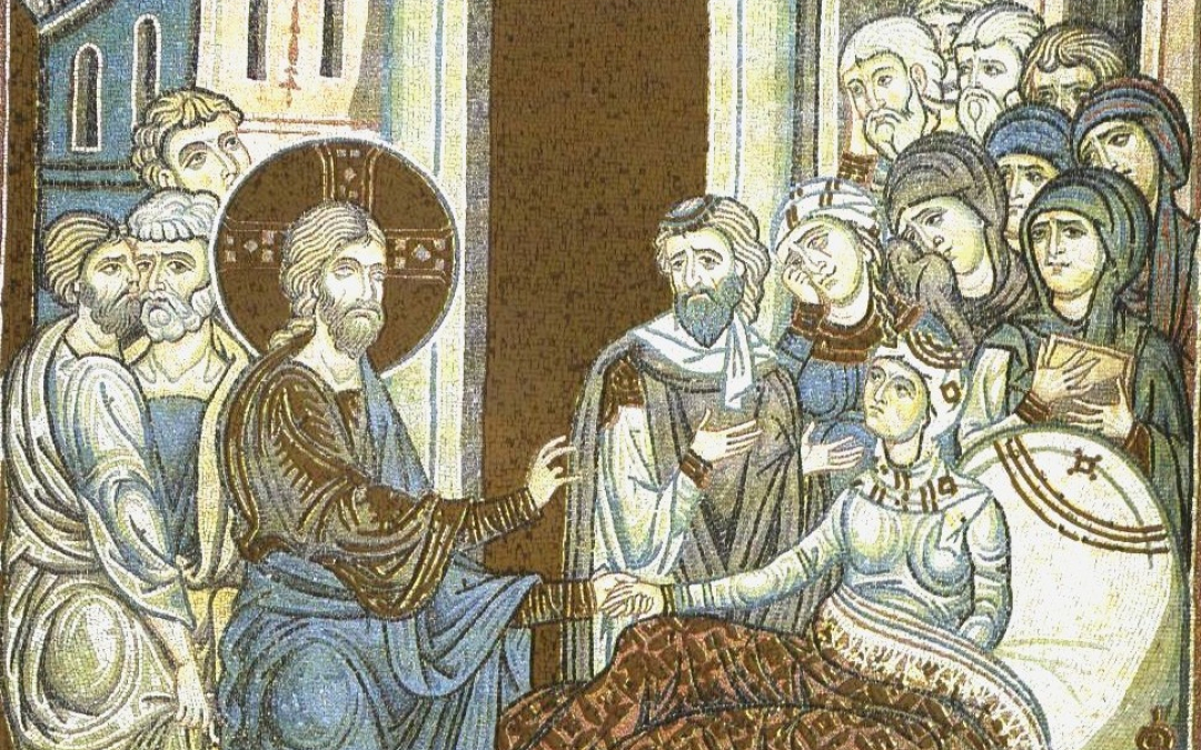 Evankeliumissa synagogan esimies Jairos anoo Jeesusta parantamaan kuolemaisillaan olevan tyttärensä. Matkalla tytön luo kauan verenvuototaudista kärsinyt nainen koskettaa salaa Jeesuksen viittaa ja paranee. Jeesus sanoo naisen uskon parantaneen hänet.
